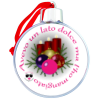 Palla di Natale in plastica stampata fronte e retro con nastrino in velluto rosso. La stampa viene effettuata su carta patinata lucida. Dimensione: 8x8 cm